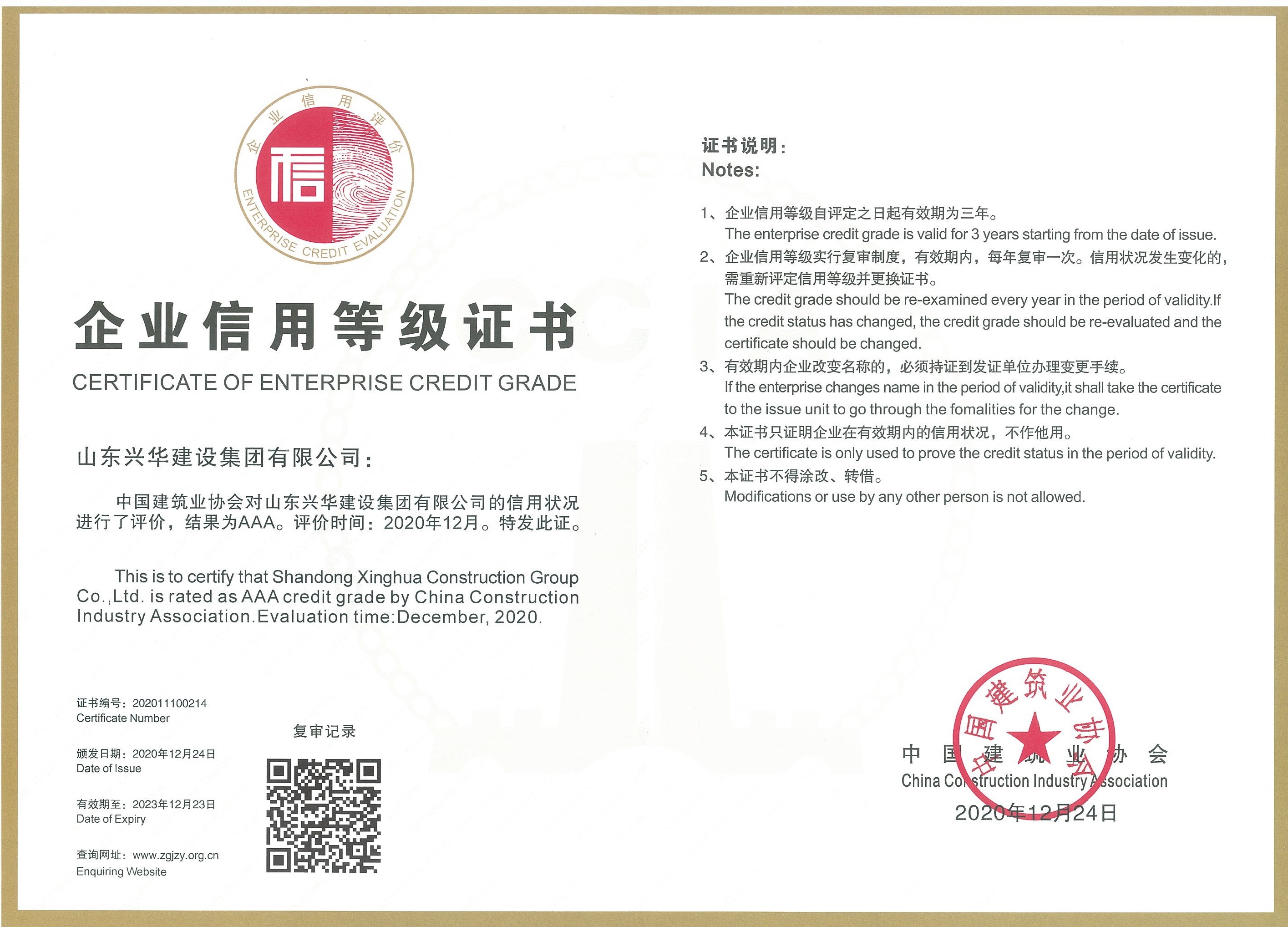 根據《社會信用體系建設規劃綱要(2014-2020年)》(國發〔2014〕21號)、《建筑市場信用管理暫行辦法》(建市〔2017〕241號)文件精神,按照《建筑業企業信用評價辦法》(建協〔2018〕18號)的要求,中國建筑業協會組織開展了2020年度建筑業AAA級信用企業評價工作。憑借良好的信譽,公司被中國建筑業協會評定為AAA級信用企